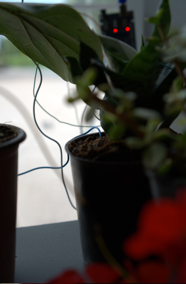 Instalación biointeractiva con plantas reales, sensores GSR y conversión de conductancia en datos musicales.